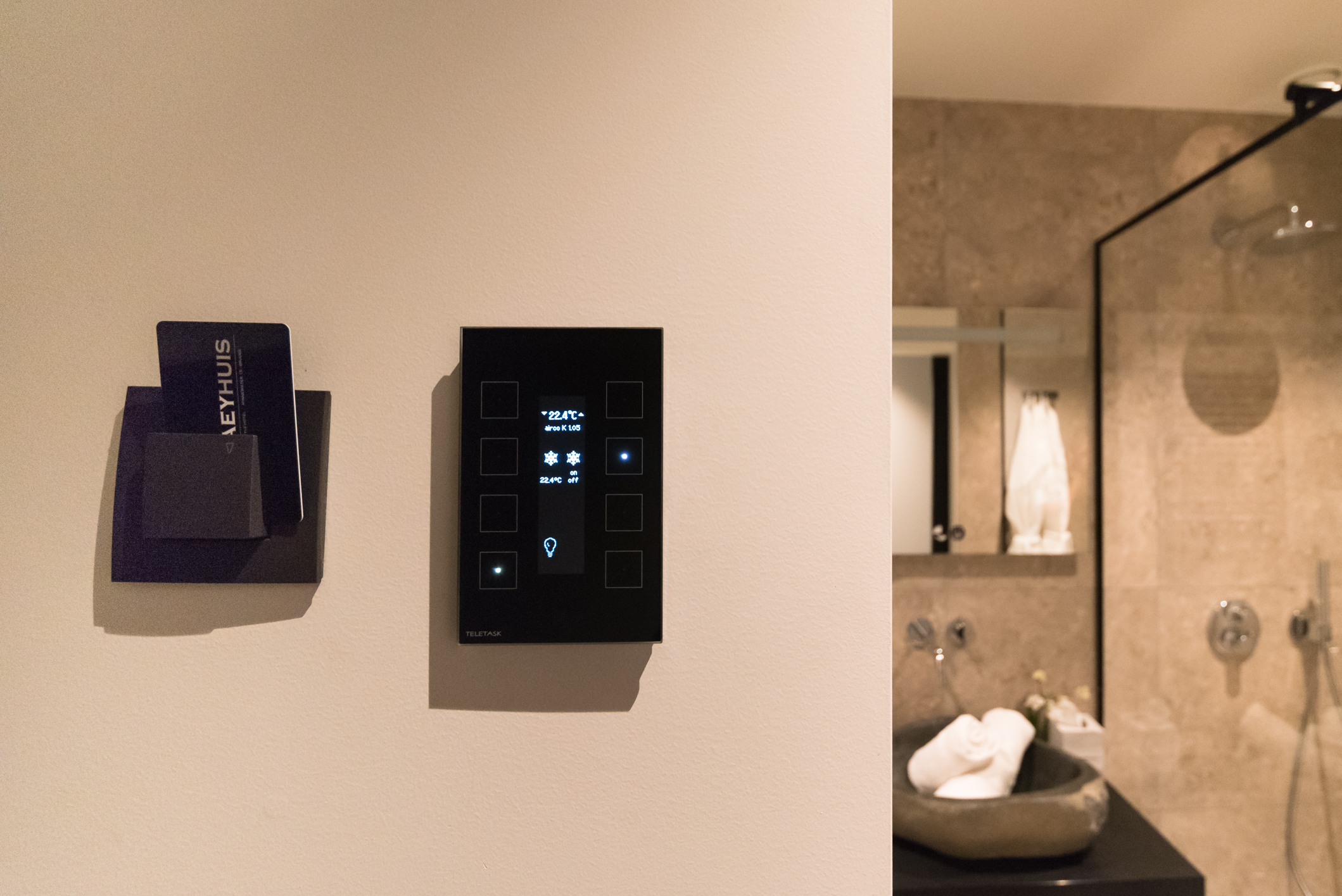 In order to enter their room the guests put their accesscard in the provided reader and the lighting, heating/cooling are immediately correctly set. Guests can adjust the lighting, heating and airconditioning easily by themselves with the userfriendly AURUS OLED touchpanel in every room - without any further explanation from the hotel staff.