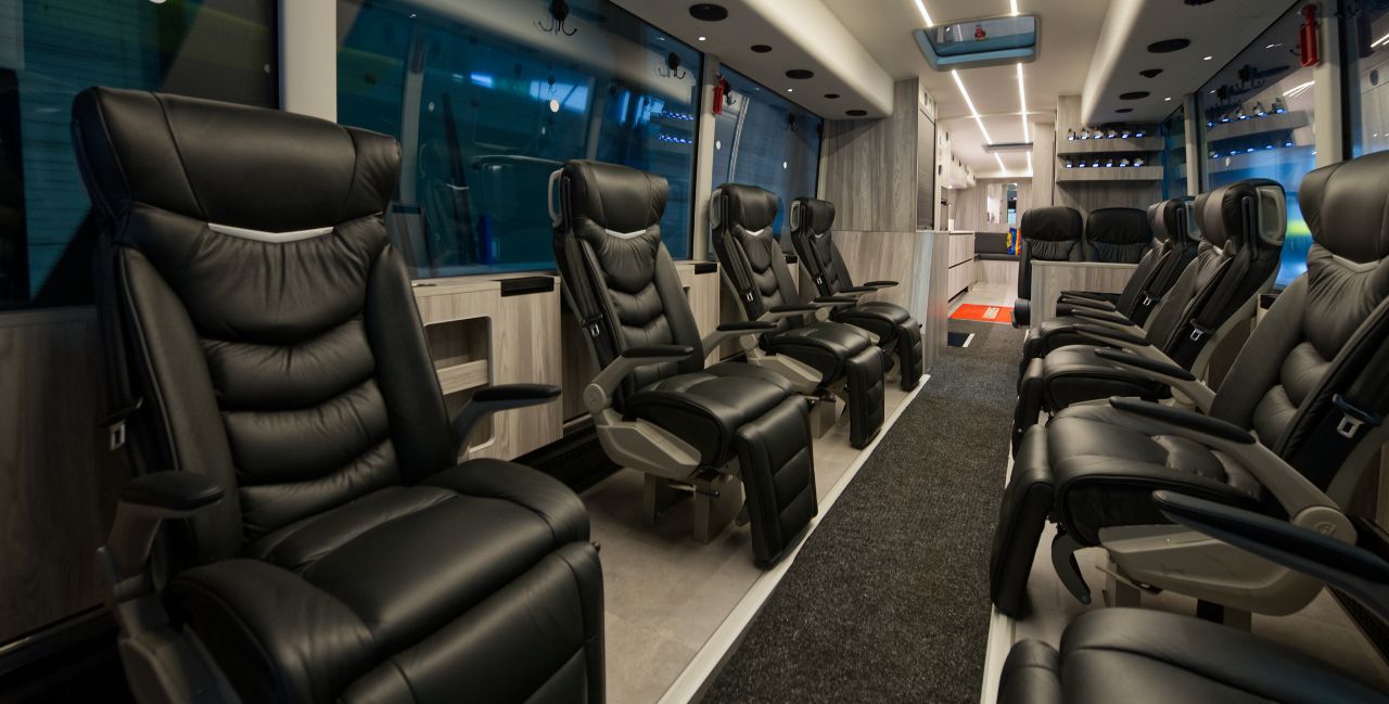 When the coach is stationary, the driver activates ‘hotel mode’ via ATMOS. This makes it possible to extend the awning, open sliding drawers, and let riders adjust their personal settings via the PENTUS touchscreen, so everyone can unwind in their own way.
