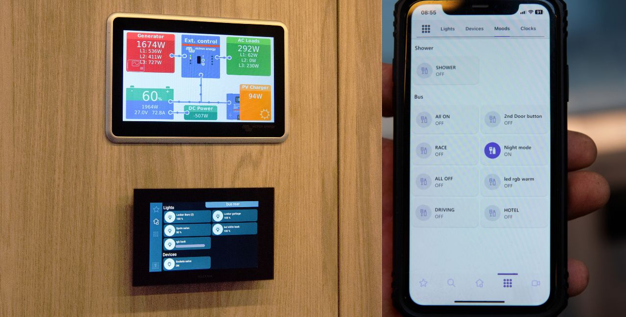 Thanks to the TELETASK system, the lighting is energy-efficient and adjustable. The ATMOS app makes it possible to set different scenes, such as ‘road mode’ at departure, where interior lighting is automatically adjusted, sliding drawers close, and the awning is retracted for safety reasons.