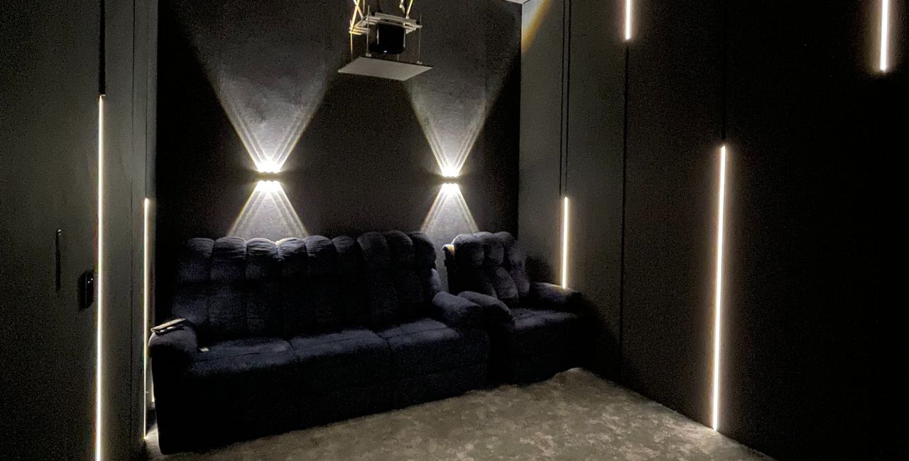 Home theater: an immersive cinematic experience featuring a state-of-the-art projector and sound system, perfectly programmed to transport you to the world of movies with just one touch.