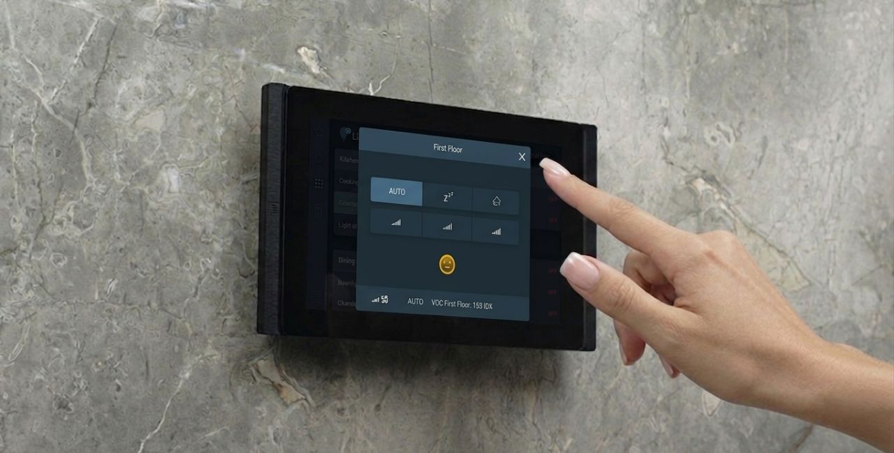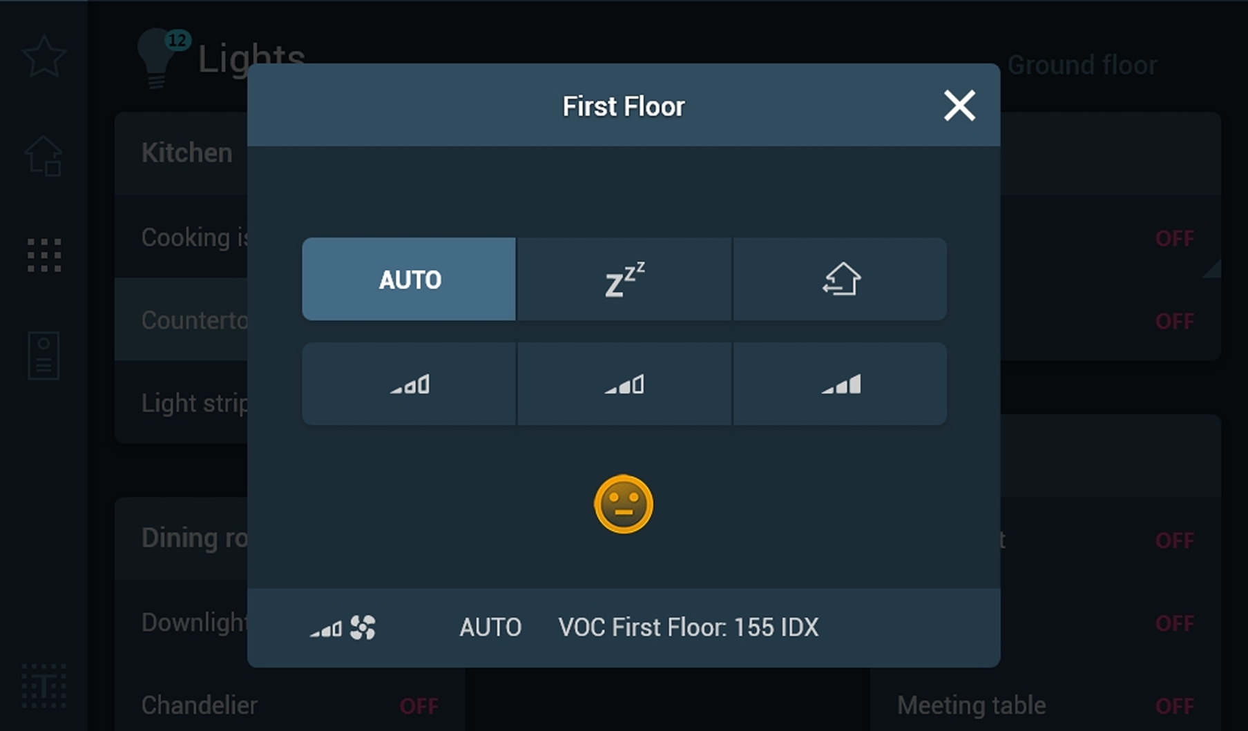 There is also additional intelligence thanks to the many parameters available within a TELETASK system. For instance, the TELETASK system knows when nobody is at home and air quality is relative. Or when everyone is asleep and it is better for the ventilation not to immediately run at full speed if it is not truly necessary. Manual intervention is possible in different ways. You can select “silent mode” if a housemate or a baby needs to sleep during the day. You can also easily switch the ventilation proactively to a higher speed because you are about to light the fire or when you are having a party and expect a large number of guests. Even though this is not really necessary, because TELETASK continuously monitors and quickly anticipates the air-quality measurement(s) in one or more rooms. But if the manual control is, for example, set to the lowest speed and air pollution increases too much (for example, increased CO2 concentration), the TELETASK system will still take over again until the issue has passed. In short, with TELETASK ventilation control you can be worry-free and enjoy optimally healthy air. And you can always check by taking a look to the smilleys on your user interfaces. A sad-looking smilley will soon be transformed into a happy or excited one!