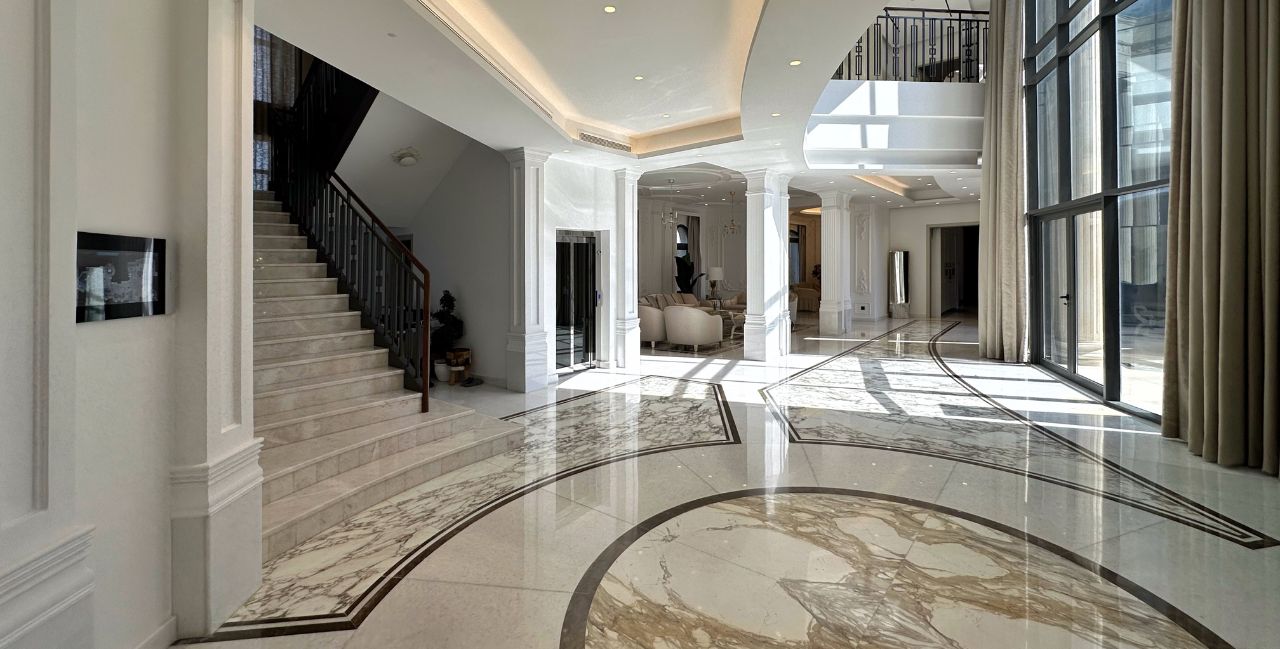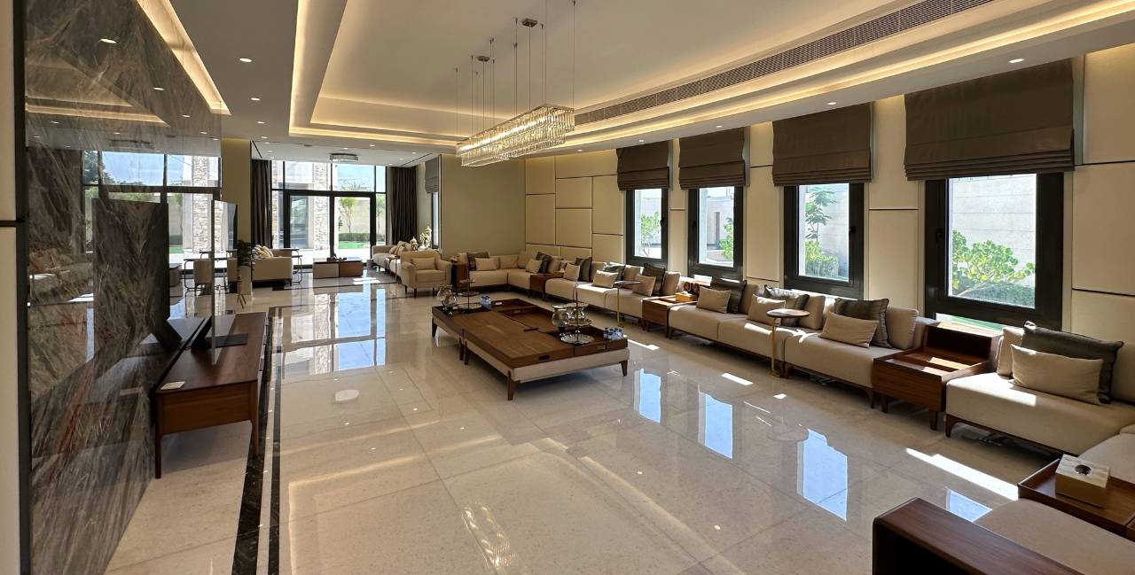 Met een oppervlakte van 2000 m² biedt de statige villa ruim voldoende plaats voor de negen bewoners. Het is een huis om in te verdwalen, met extra grote kamers, meerdere keukens en eetruimtes, een master bedroom met aparte zitruimte, een luxueuze dressing, en twee ‘majlis’- typisch Arabische zitruimtes voor vrouwelijke en mannelijke gasten. Het indrukwekkende interieur is overwegend wit en afgewerkt met kwaliteitsvolle natuurlijke materialen zoals hout, natuursteen en veel marmer.