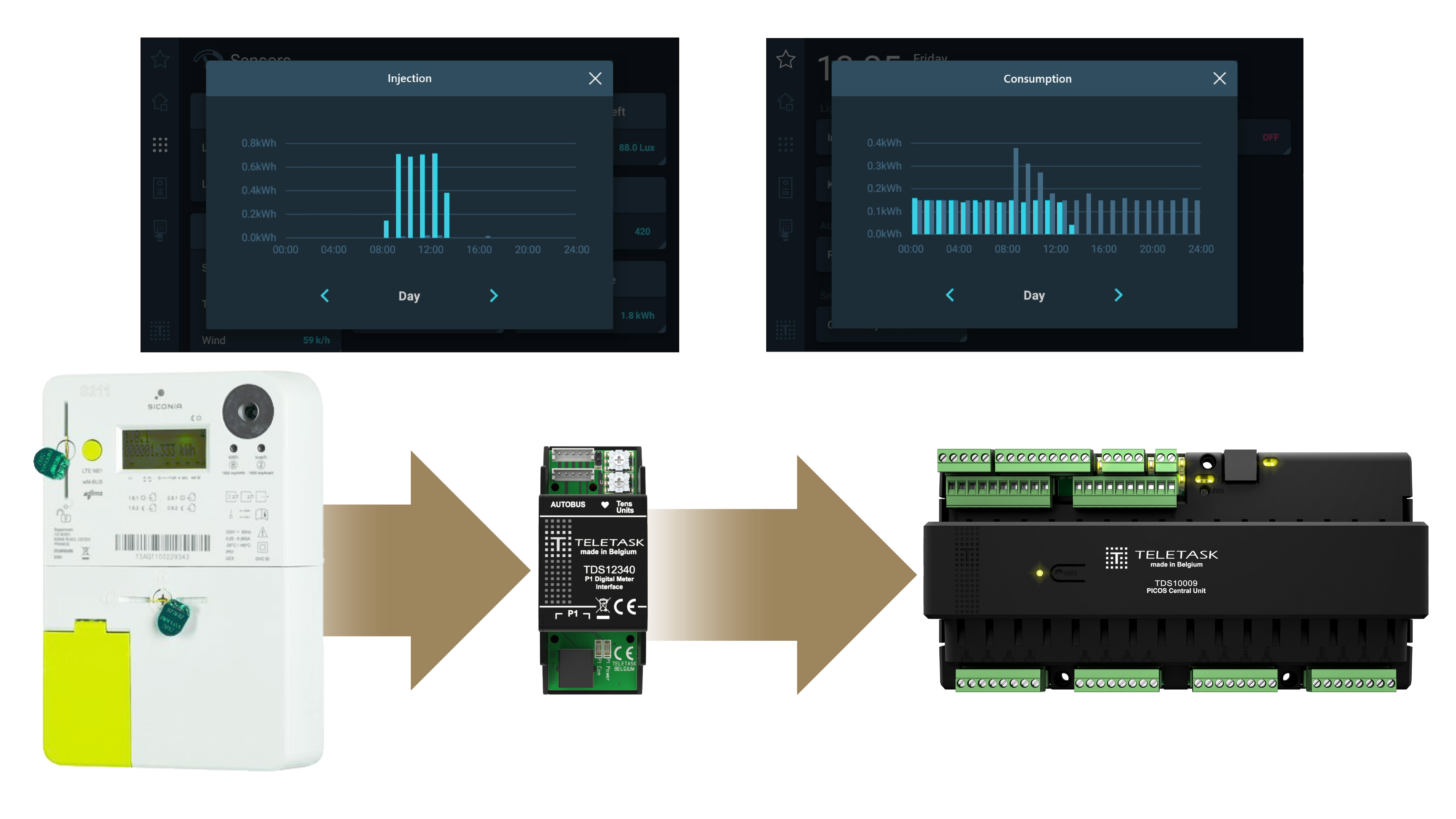 Het TELETASK-systeem biedt verschillende mogelijkheden om het verbruik en de opbrengst van energie te visualiseren. Zo kunt u op een toetsenpaneel of aanraakscherm de opbrengst van uw fotovoltaïsche panelen raadplegen. Of misschien wilt u uw opbrengst van gisteren, vorige week, maand of jaar bekijken? Geen probleem. Zelfs grafieken zijn mogelijk. Bovendien kan u ook zowat alles raadplegen en bijsturen via uw smartphone.