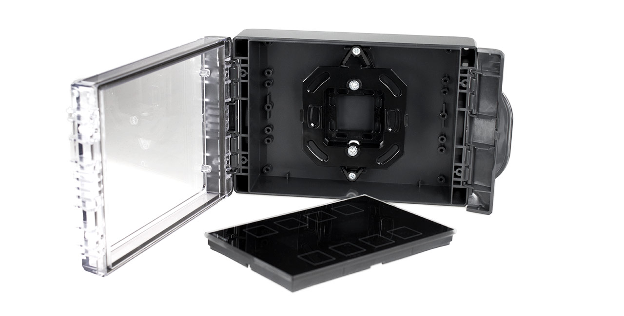 Caixa de estanque com porta transparente para instalação embutida em paredes planas. Adequada para instalação de painéis tácteis AURUS numa aplicação protegida. Pode ser instalada tanto vertical como horizontalmente. A porta pode ser fechada manualmente. Estão disponíveis duas opções para abrir a caixa embutida: com ou sem ferramentas (chave de fendas plana). Ambas as opções estão incluídas na embalagem.